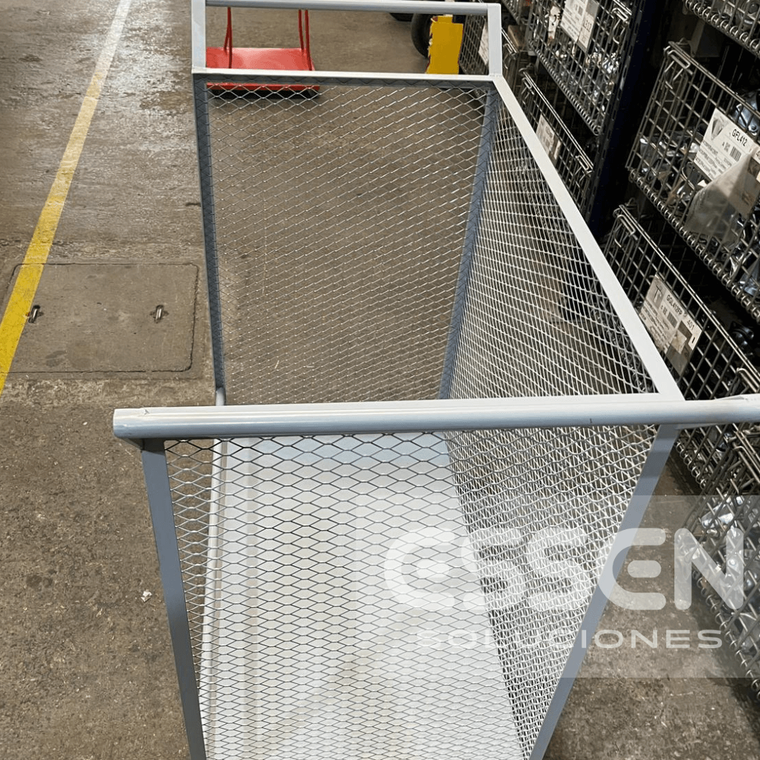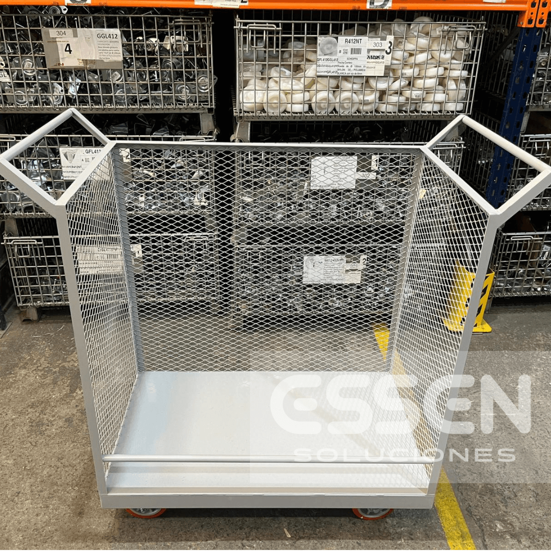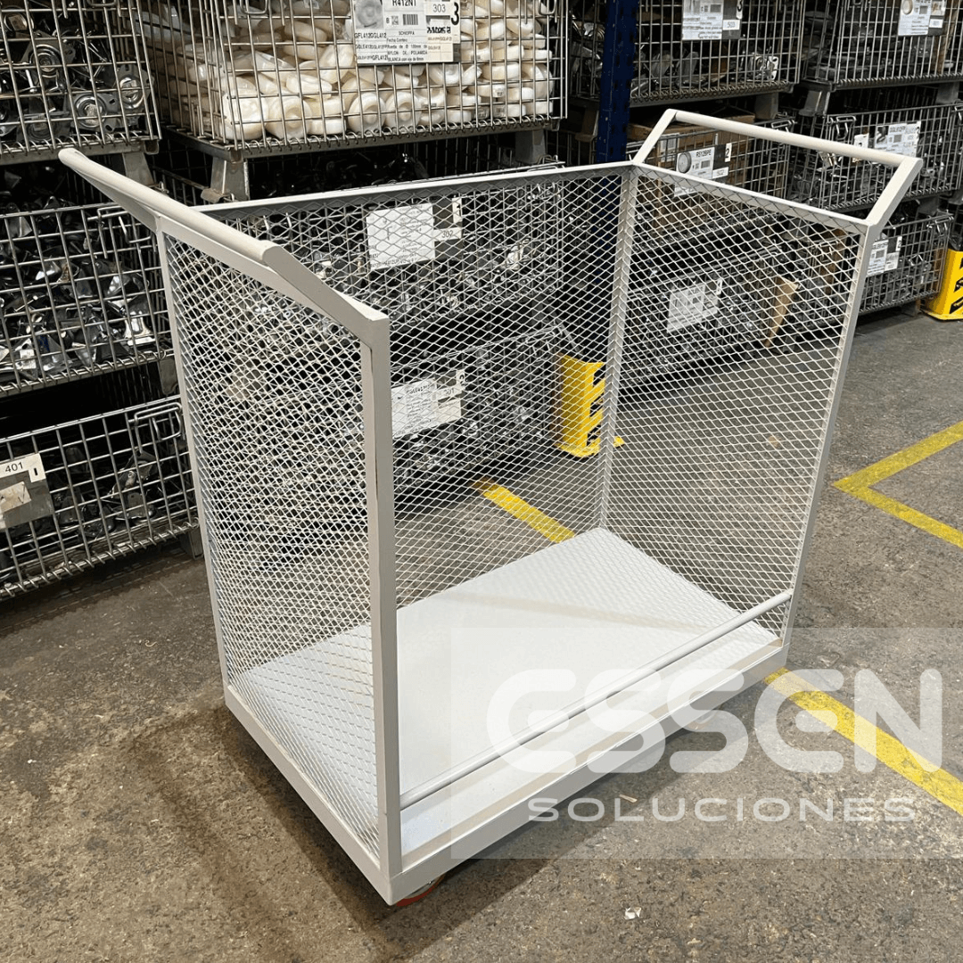 Carro cesto con 4 ruedas con tres barandas. Paredes de malla metálica. Ruedas que se adaptan a distintos tipos de suelo.